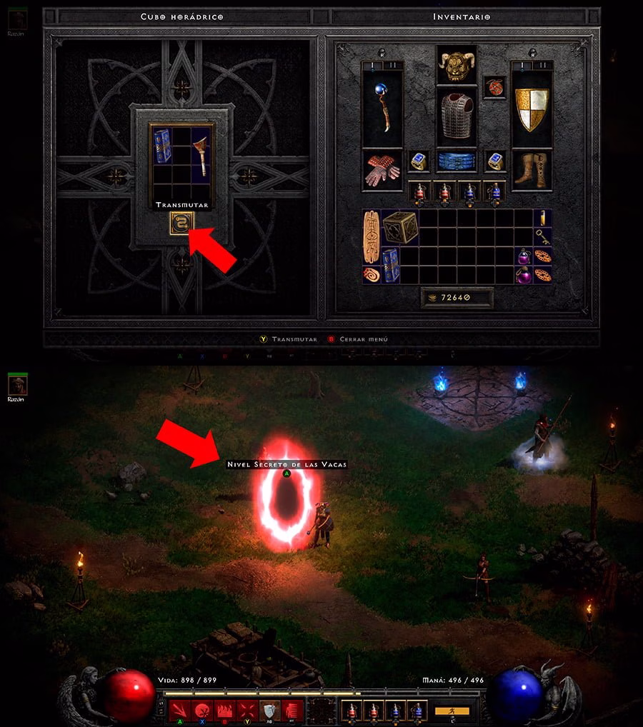 En el campamento, meteremos «La pierna de Wirt» en el cubo horádrico, junto a un tomo de portales de la ciudad y le daremos a transmutar. Así, se abrirá el nivel secreto de las vacas locas, verás un portal rojo donde debes entrar.