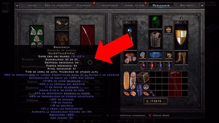 Una vez tengamos todo, simplemente debemos colocar las runas por orden y nuestra arma de asta se convertirá en la palabra rúnica Obediencia. Un arma poco conocida en Diablo 2 Resurrected pero muy útil y versátil para nuestro mercenario.
