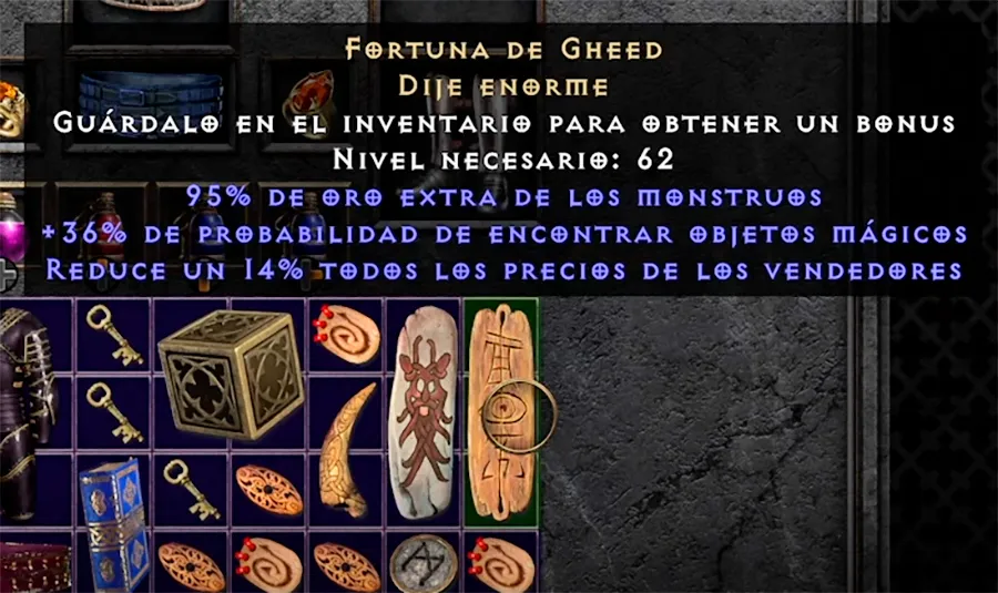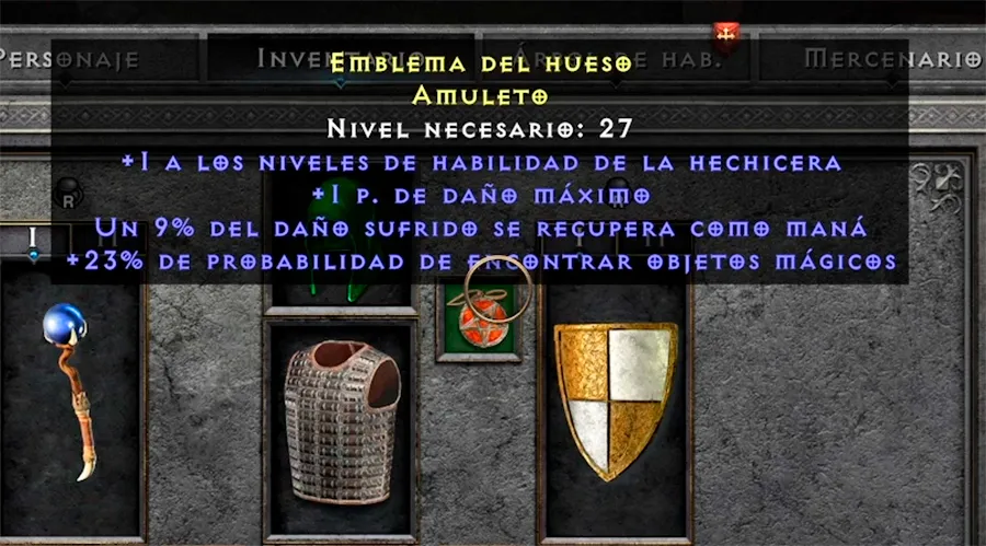 Aquí lo ideal es encontrar un amuleto raro (amarillo) o crafteado (naranja) que nos aporte algo de Magic Find. En mi caso encontré este «Emblema del Hueso» que ofrece un +23% de MF, pero son muchas las personas que no dedican especial atención al MF en el amuleto y prefieren usar un Mara o el amuleto de Tal Rasha.