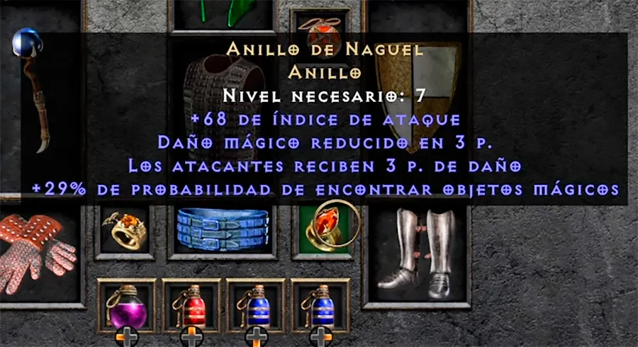 El Anillo de Naguel es el único que nos ofrecerá entre un 15% y un 30% más de probabilidades de encontrar objetos mágicos. Por lo que no es mala idea equiparnos con dos de estos anillos para aumentar nuestro MF.