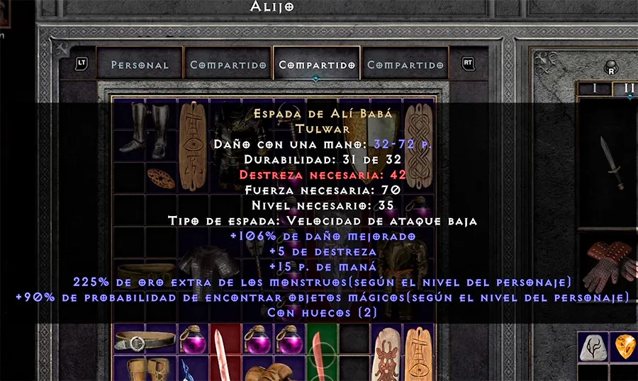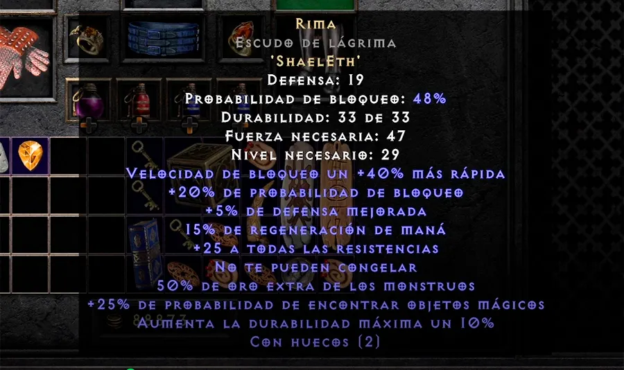Cómo escudo son muchas las personas que llevan en el equipo principal un escudo Espíritu y cómo esquipo secundario un escudo Rima. Sin embargo, si lo que queremos es tener el máximo MF posible con el equipo principal, podemos equipar el Rima y nos aportará un +25% de Magic Find (aunque perderemos el FCR y el +2 a todas las habilidades del Espíritu).