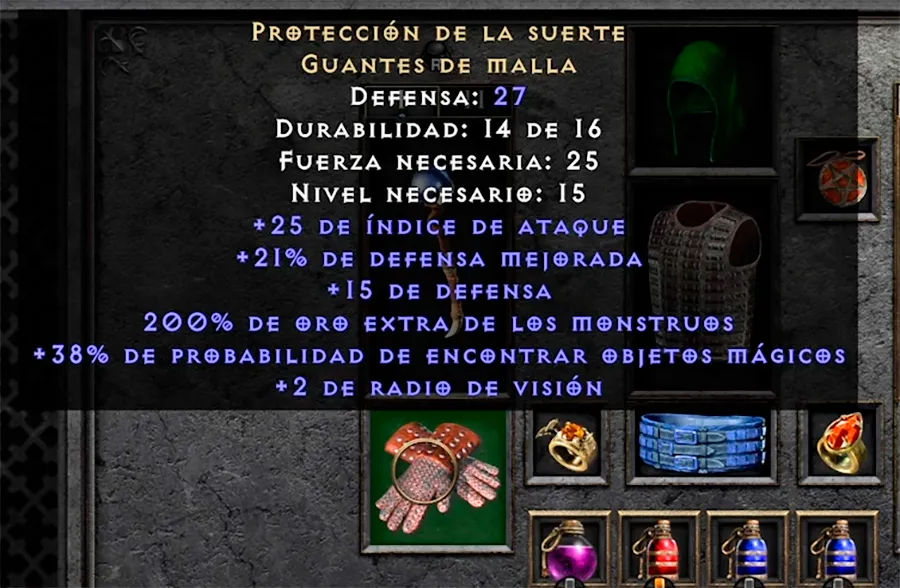 Los guantes de malla «Protección de la suerte» son sin duda nuestra mejor opción para sumar un poco de Magic Find a nuestro personaje. Estos guantes tienen un MF variable que va desde el +25% al +40% de probabilidades de encontrar objetos mágicos.