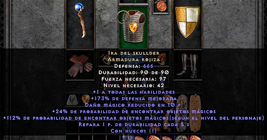 La Ira de Skullder, coloquialmente conocida cómo «Armadura Rojiza» es sin lugar a dudas la armadura que más MF nos aportará un +1.25 de probabilidad de encontrar objetos mágicos por nivel del personaje. Además, podemos engarzarla con una runa IST (+25% de MF) o con un topacio perfecto (+24% de MF). Entre sus atributos también destaca el +1 a todas las habilidades y la defensa mejorada.
