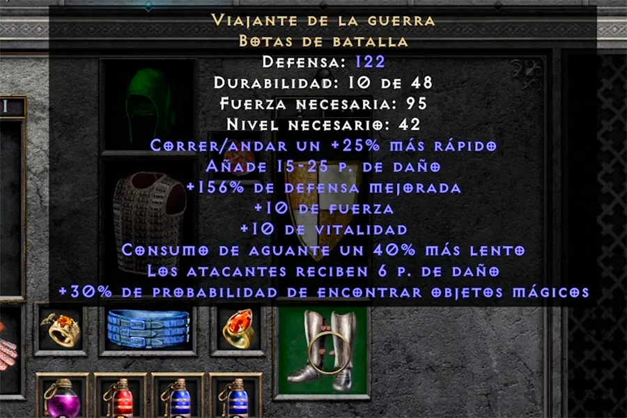 No existen mejores botas en todo el juego en cuanto a Magic Find se refiere, y es que las War Traveler o Viajante de la guerra nos ofrecerán entre un +30% y un +50% de MF. Además de un 25% de correr/andar más rápido, entre otros atributos.