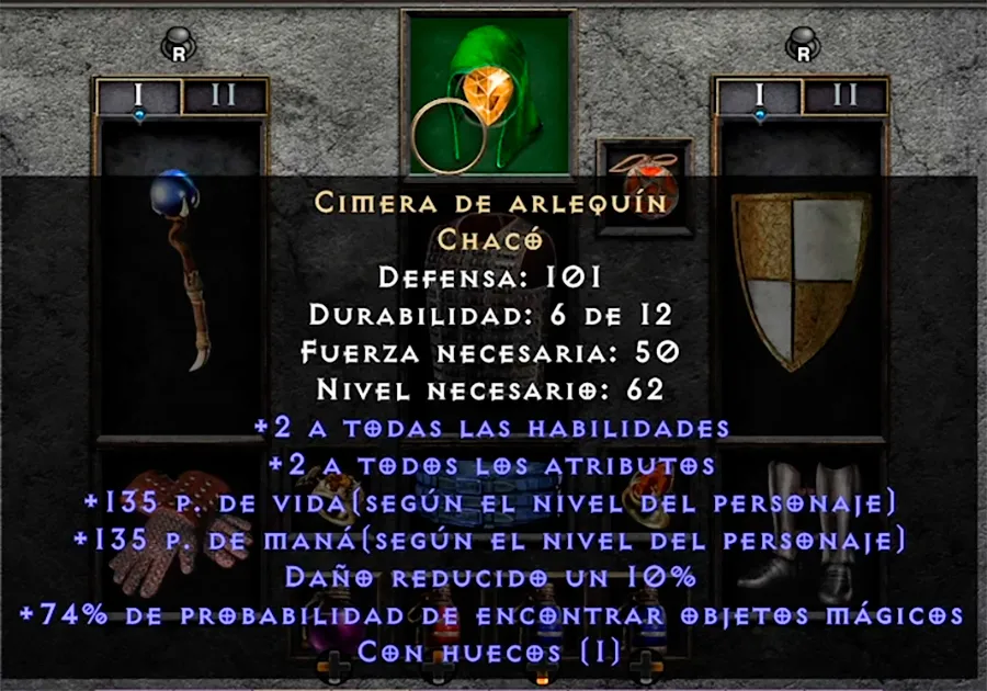 Aquí no hay duda alguna, por amplia goleada gana la conocida Cimera del Arlequín, coloquialmente más conocida cómo «Chacó«. Se trata del mejor yelmo con diferencia porque no solo nos aportará un +50% de probabilidad de encontrar objetos mágicos, sino que también nos aporta un +2 a todas las habilidades, vida y maná entre otros atributos.