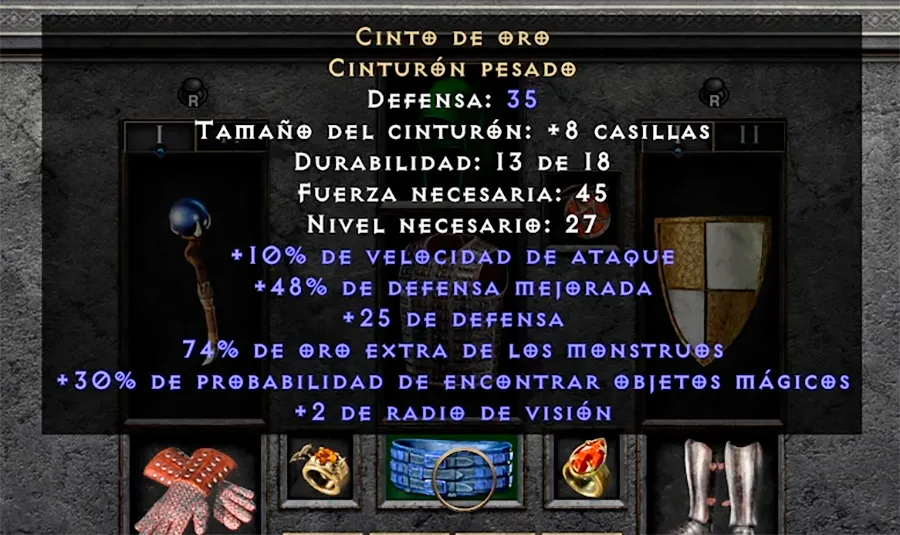 El cinturón pesado «Cinto de oro» es sin lugar a dudas el más recomendable para nuestra hechicera de MF. Sumará un +30% de probabilidades de encontrar objetos mágicos y además nos dará un +10% de velocidad de ataque. Por contra, no tiene mucha defensa.