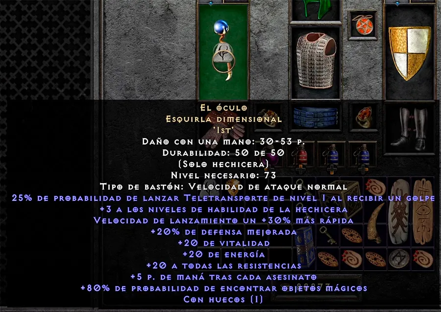 Obviamente nos decantamos por un arma de una mano, para poder llevar un buen escudo en la otra que nos aportará más MF o velocidad de lanzamiento, entre otros atributos. El Óculo es el arma por excelente para cualquier hechicera de MF, porque nos dará un +50% de probabilidad de encontrar objetos mágicos. Y si le engarzamos una runa IST, obtendremos nada menos que un total de +80% de MF.