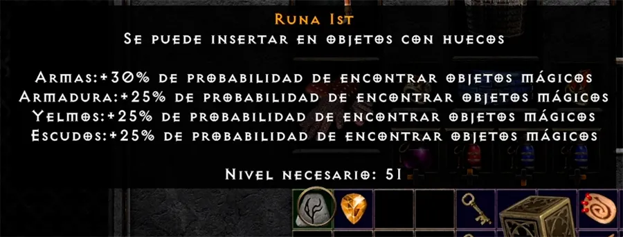 En los items donde podamos engarzar, debemos tener en cuenta que solamente en las armas nos sale realmente rentable gastar una de nuestras preciadas runas IST, la cuál aumentará un 30% el MF. Para armaduras y Yelmos, la IST solo aporta un +25% y el topacio perfecto un +24%, así que debido a esa mínima diferencia, lo recomendable es utilizar un topacio perfecto.