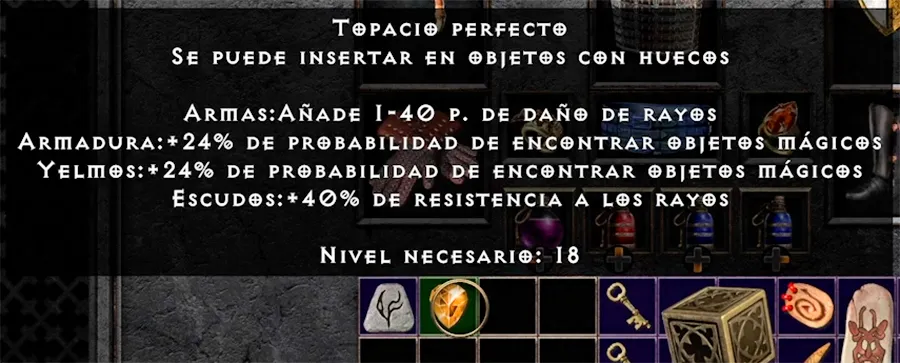 Nunca engarces en un arma un topacio perfecto, tampoco en un escudo, porque no aportan MF.